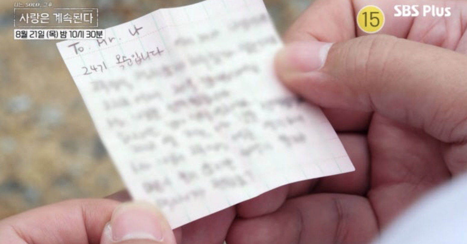 24기 옥순은 미스터 나에 대한 관심도 표현하기 위해 열심히 쪽지를 썼습니다. '상남자' 미스터 나의 마음을 꽁꽁 붙들어 놓으려고 새로운 전법까지 구사하는데, 과연 24기 옥순의 노력이 이번엔 통할 수 있을지에 궁금증이 솟구칩니다. 저는 이 '쪽지'라는 '아날로그적인 감성'이 '상남자' 미스터 나의 마음을 움직일 수 있을 것이라고 예상했습니다.
