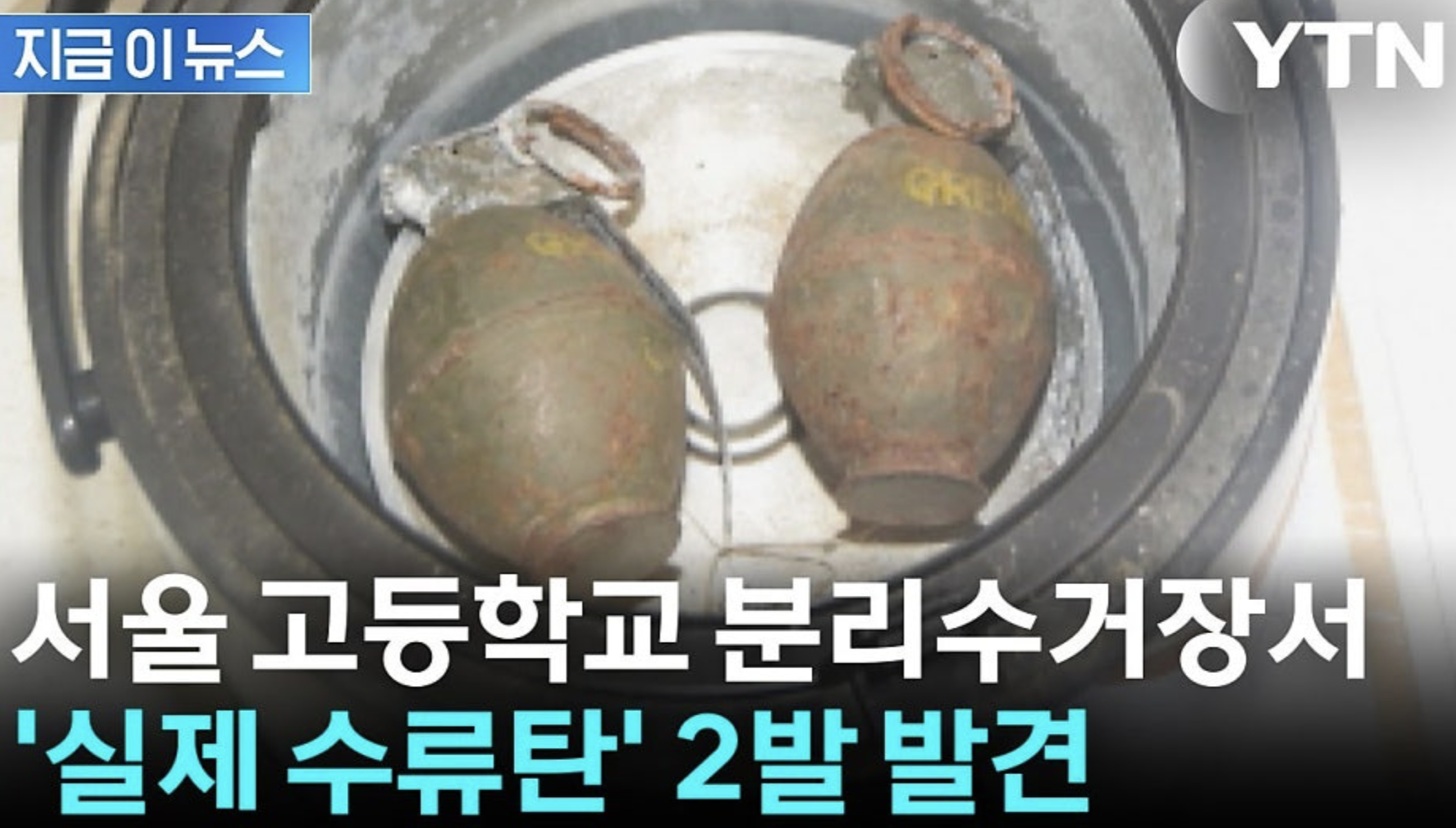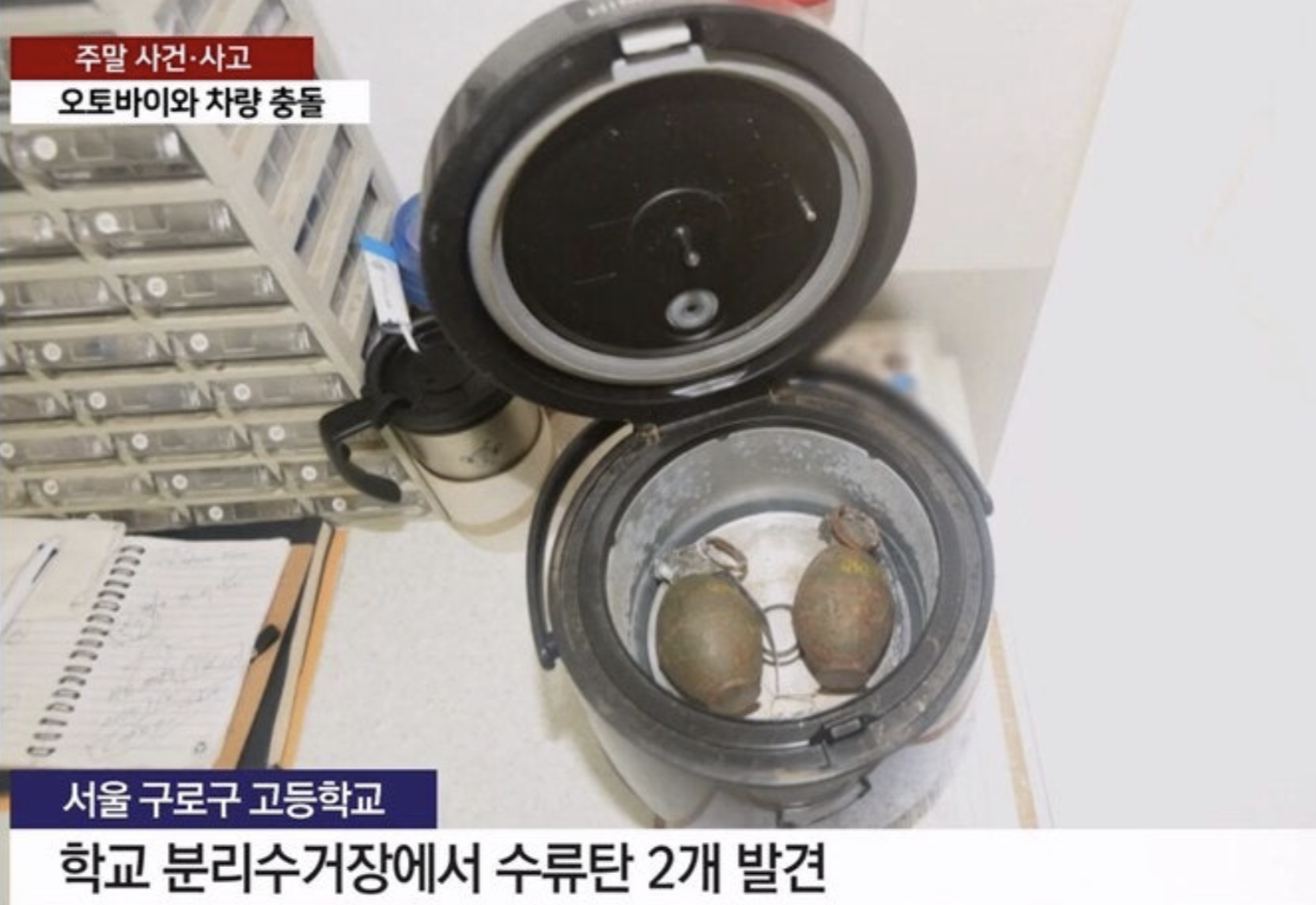 학교 경비원이 분리수거장에서 실제 수류탄 2발을 발견한 것이죠.
