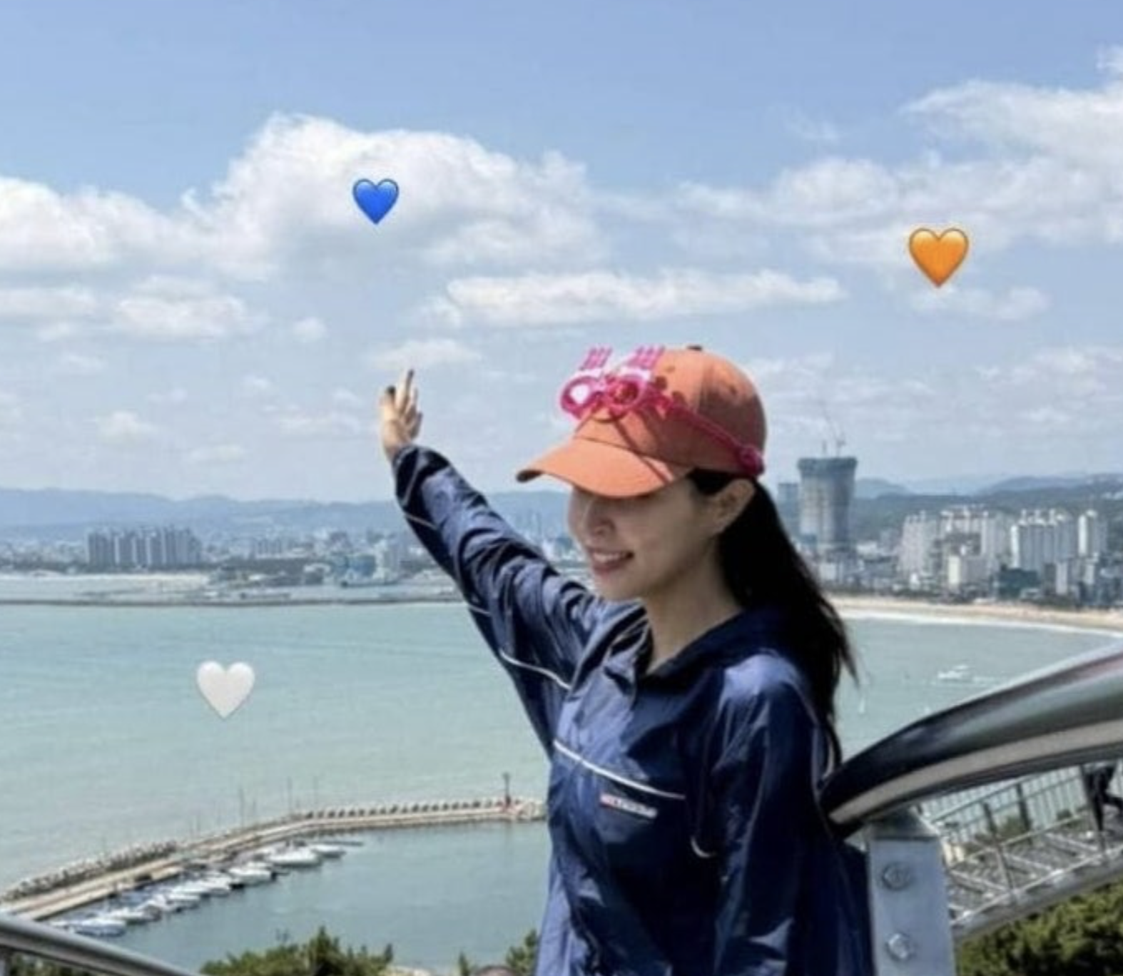 전망대에서 찍은 사진인데, 굳이 생일 파티용 안경을 모자에 달 이유가 없죠.